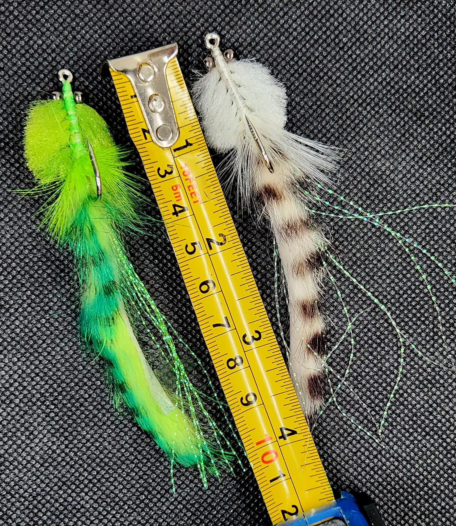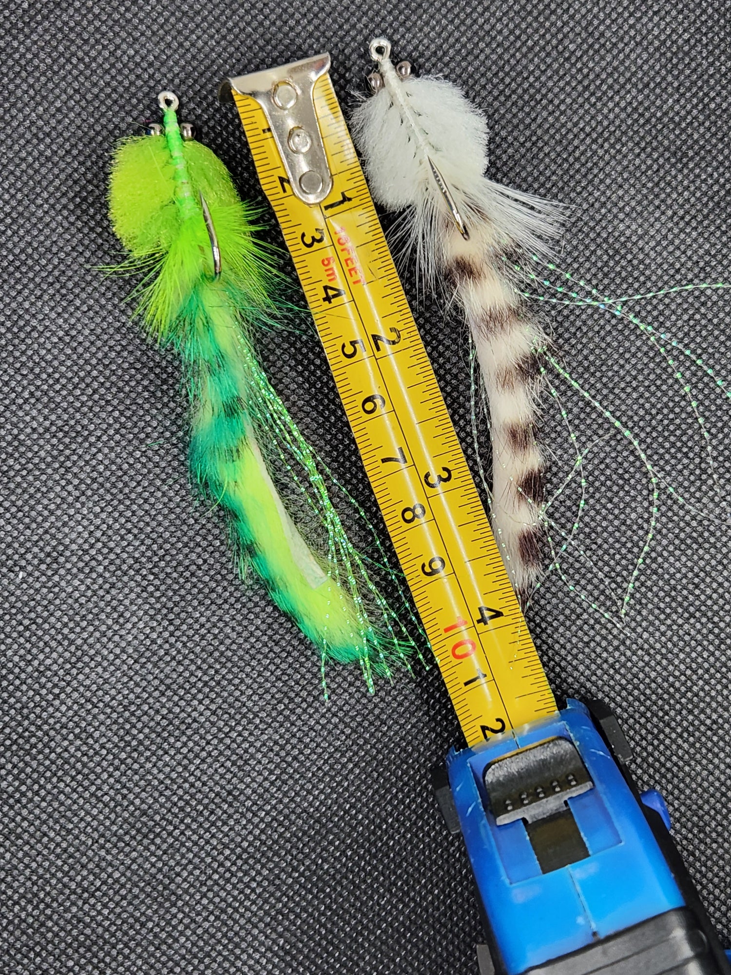 Tied on super sharp 2/0 lt water hooks. Total fly length is 4"