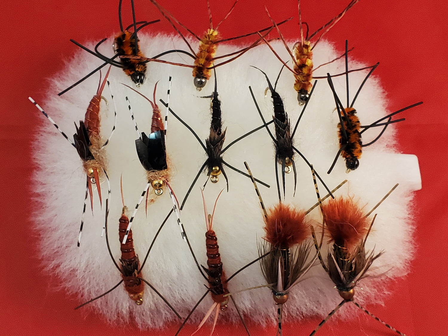 This is a ONE Dozen Fly Selection - 12 Bead Heads Stonefly Nymphs. All nymphs size #6 through #10. Included are both standard and tungsten beads. All selections are exactly what is in the photos.
