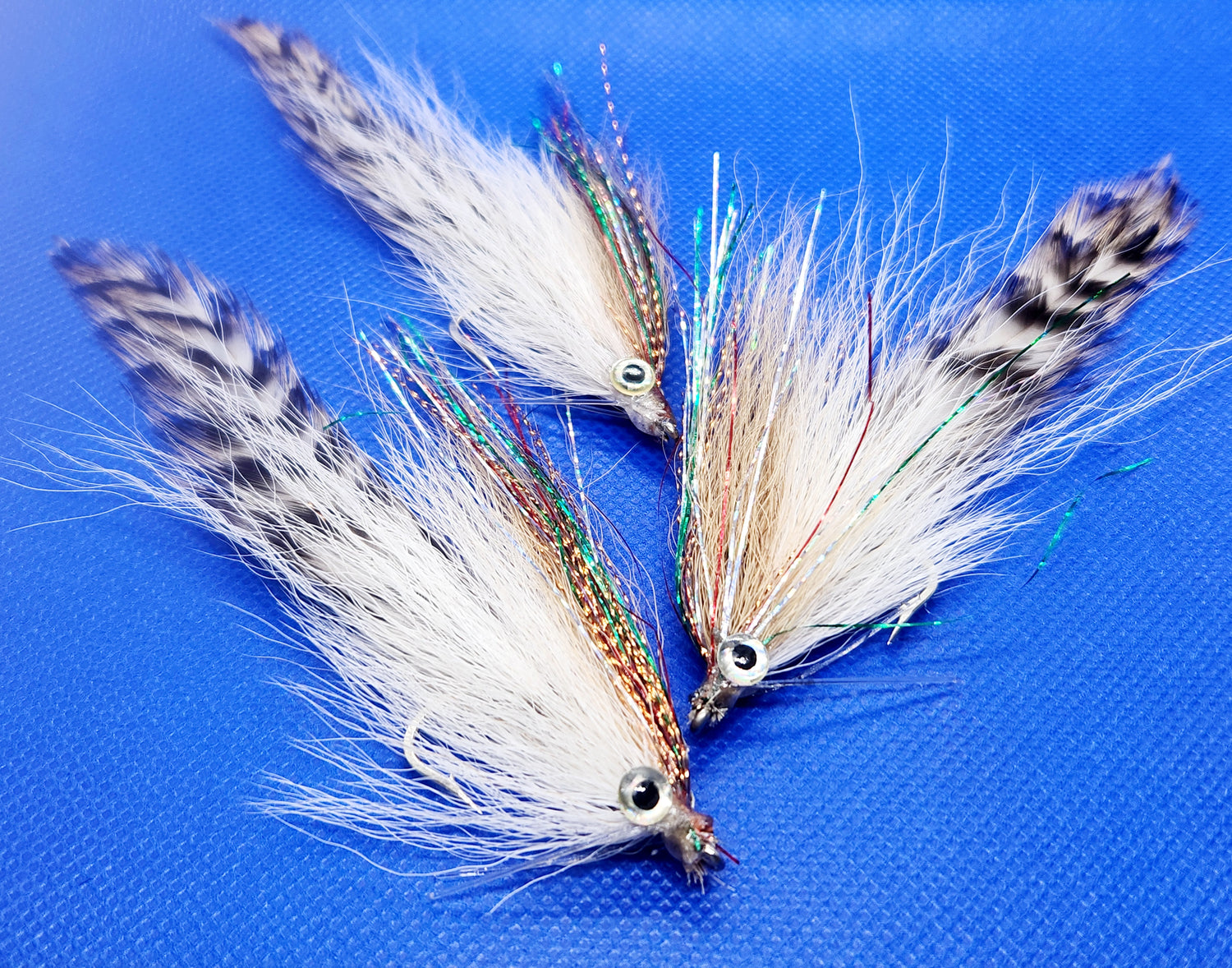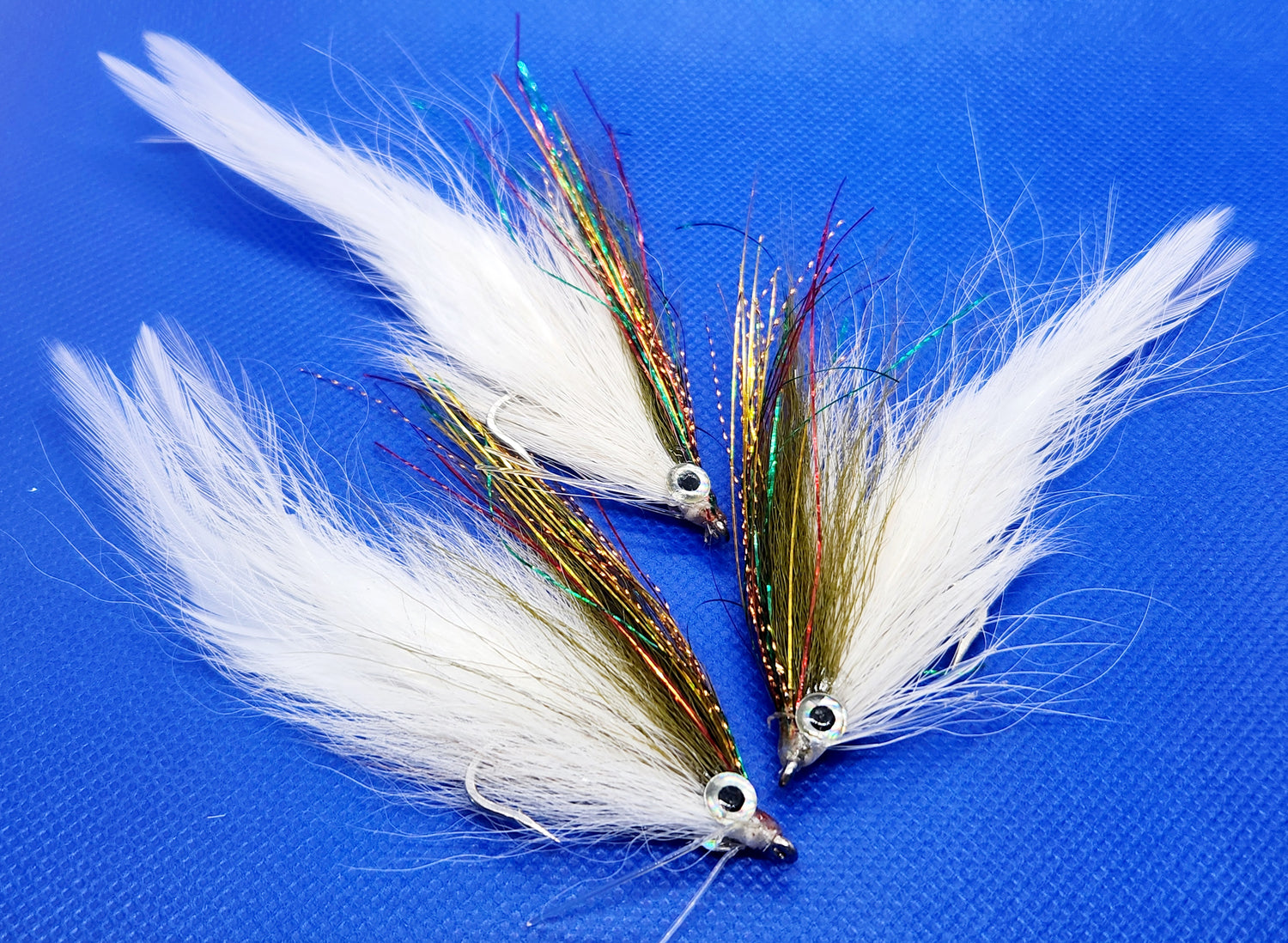 Florida tackle shops, often priced at $10 or more. Available in four effective color patterns—Olive/White, Blue/White, Chartreuse/White, and Tan/White—these flies accurately mimic common forage fishes in both freshwater and saltwater environments. Offered individually and in packs of 3, 4, or 8.